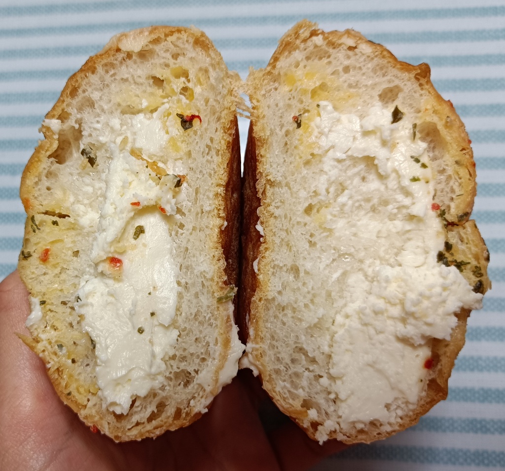 ふわふわしっとりパン。中にはチーズクリーム、チーズホイップ。たっぷり入っている。チーズクリームはもったり。チーズホイップはやわふわ。レアチーズの様な、ほんのり酸味。甘過ぎなくて美味しかった。