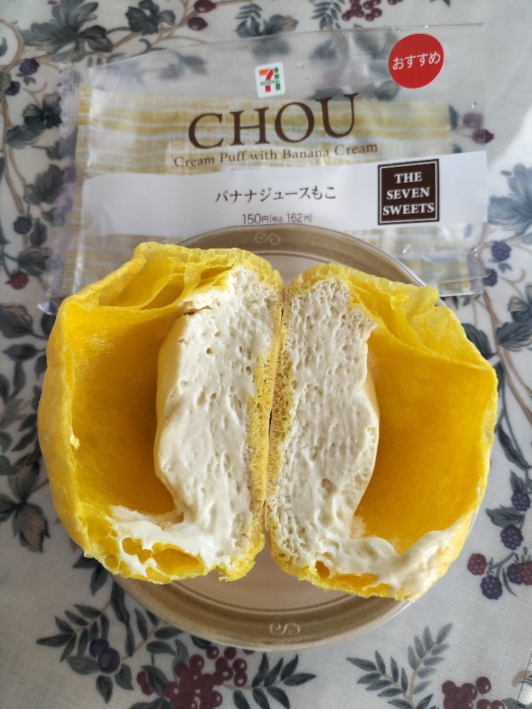 シュークリームとはちがった、もこ独特の薄い少しモチッとした皮がほんのり甘いバナナの香り🍌そして中からはぎっしりたっぷりのクリームが😲量におどろいたのももちろんですが、味もバナナそのもの✨でもどちらかというとミックスジュースに近いようなバナナ味なのですっきり甘く、クセが強すぎないフルーティーなバナナ💓良い甘さのバナナクリームが口いっぱいに広がります🎵シュークリームよりもクリームをたっぷり楽しみたい方にぴったりです😊