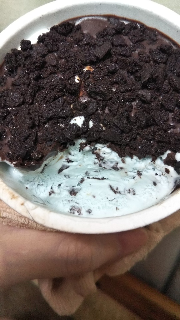 ミントの味がしっかりと味わえるチョコチップ入りミントアイスの上に、食感と食べ応えのあるチョコレートとココアクッキー乗せています。