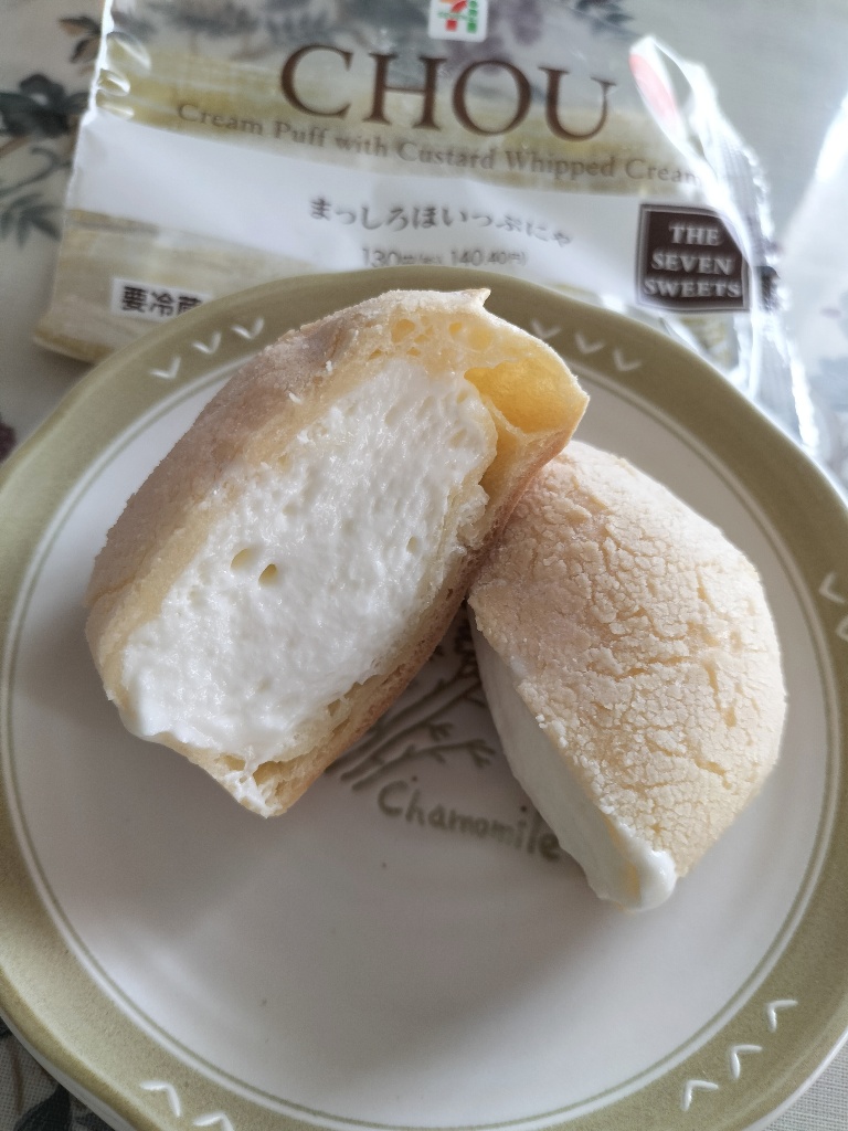 もちもちのぷにゃっとしたシュー皮に白いカスタードホイップを詰めたシュークリームです。