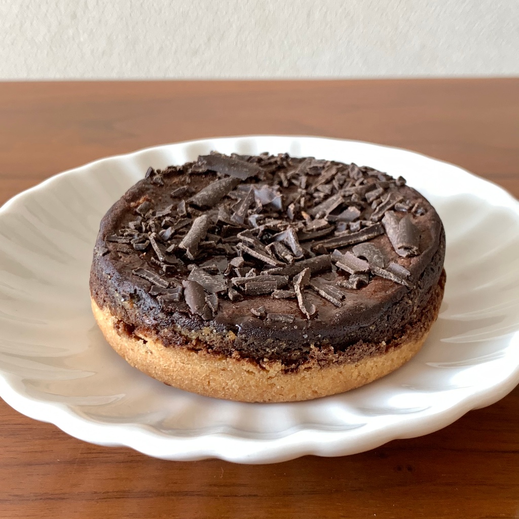 ザクザクのタルト生地に、チョコケーキ生地を重ねて焼き上げ、仕上げに削りチョコをトッピング。